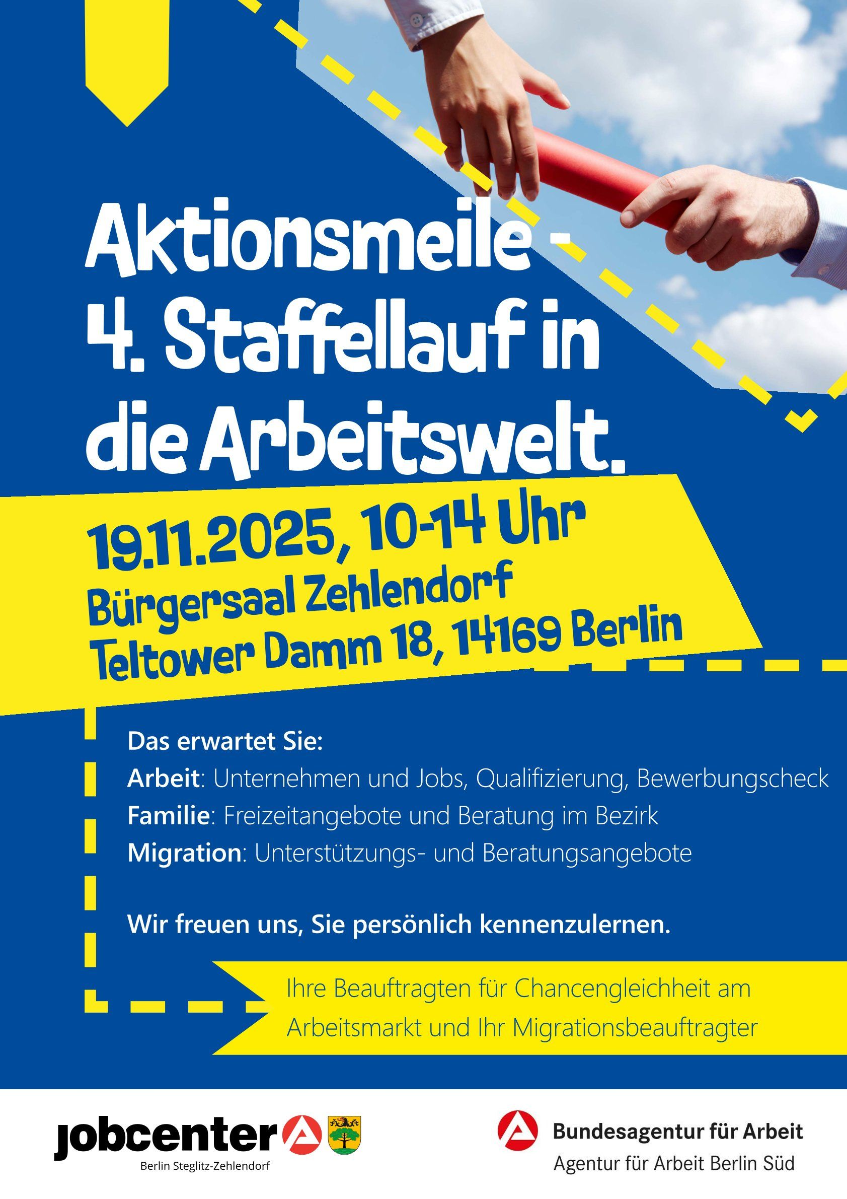 Bereits zum vierten Mal lädt das Jobcenter Steglitz-Zehlendorf gemeinsam mit der Bundesagentur für Arbeit Berlin Süd zum "Staffellauf in die Arbeitswelt" ein, der am Mittwoch, 19. November 2025, von 10 bis 14 Uhr im Bürgersaal des Rathauses Zehlendorf am Teltower Damm 18, 14169 Berlin, stattfindet.